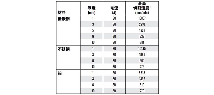 最大切割速度是根據(jù) Hypertherm 實驗室測試所得的結(jié)果。為達(dá)到最佳切割性能,各種切割應(yīng)用的實際切割速度可能有所不同。有關(guān)更多詳情,請參考《操作源手冊》。